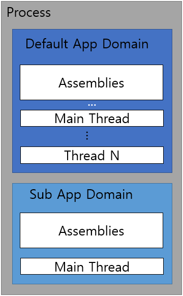 AppDomain은 Application이 실행되는 격리된 환경을 제공하는 하나의 논리적인 파티션 단위 이다. AppDomain은 Domain별로 Application을 Load/Unload를 가능하게 해준다. 즉, 특정 Application에 문제가 있으면 해당 프로세스 전체를 종료시키는 것이 아니라 해당 Application만 Unload 혹은 Reload가 가능하는 말이다.