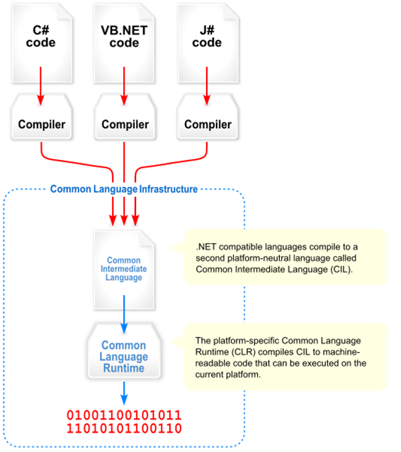- 닷넷 프레임워크 언어로 개발된 프로그램 코드는 컴파일 시 바이너리 형태로 CIL이라 불리는 파일로 작성됨